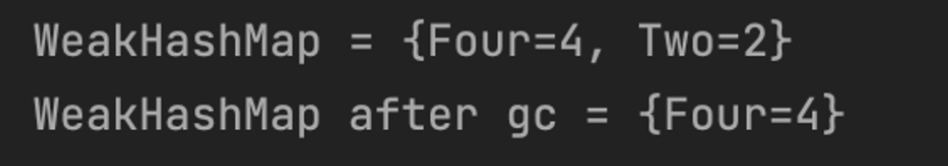 public class WeakHashMapTest { public static void main(String[] args) { WeakHashMap<String, Integer> numbers = new WeakHashMap<>(); // String two = "Two"; String two = new String("Two"); Integer twoValue = 2; // String four = "Four"; String four = new String("Four"); Integer fourValue = 4; numbers.put(two, twoValue); numbers.put(four, fourValue); System.out.println("WeakHashMap = " + numbers); two = null; System.gc(); System.out.println("WeakHashMap after gc = " + numbers); } }위 코드를 실행하면 아래처럼 결과가 나오게 됩니다.
